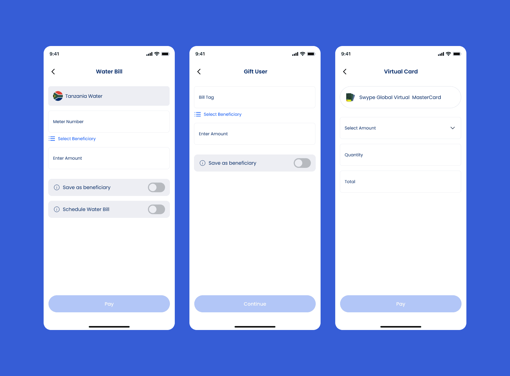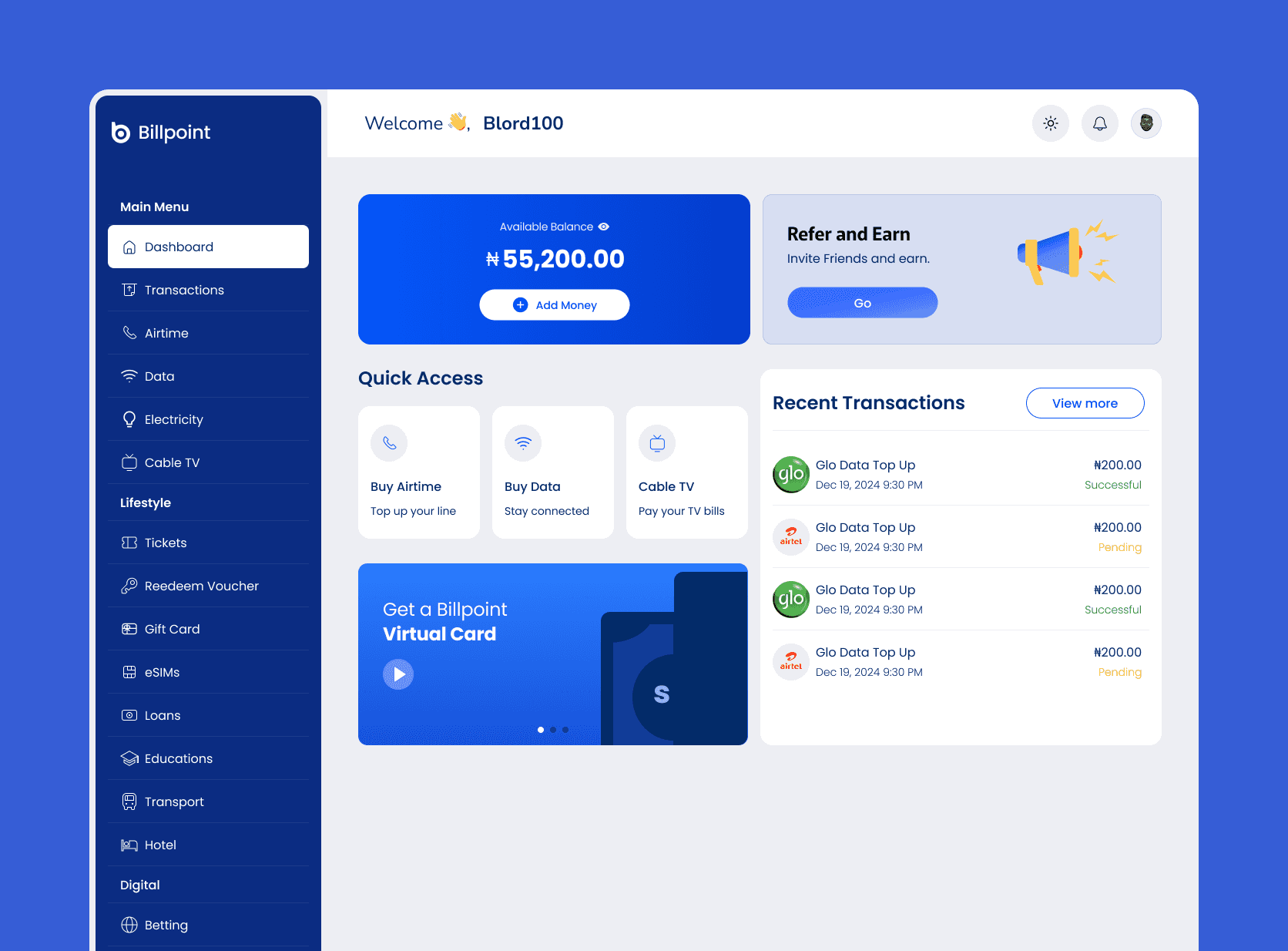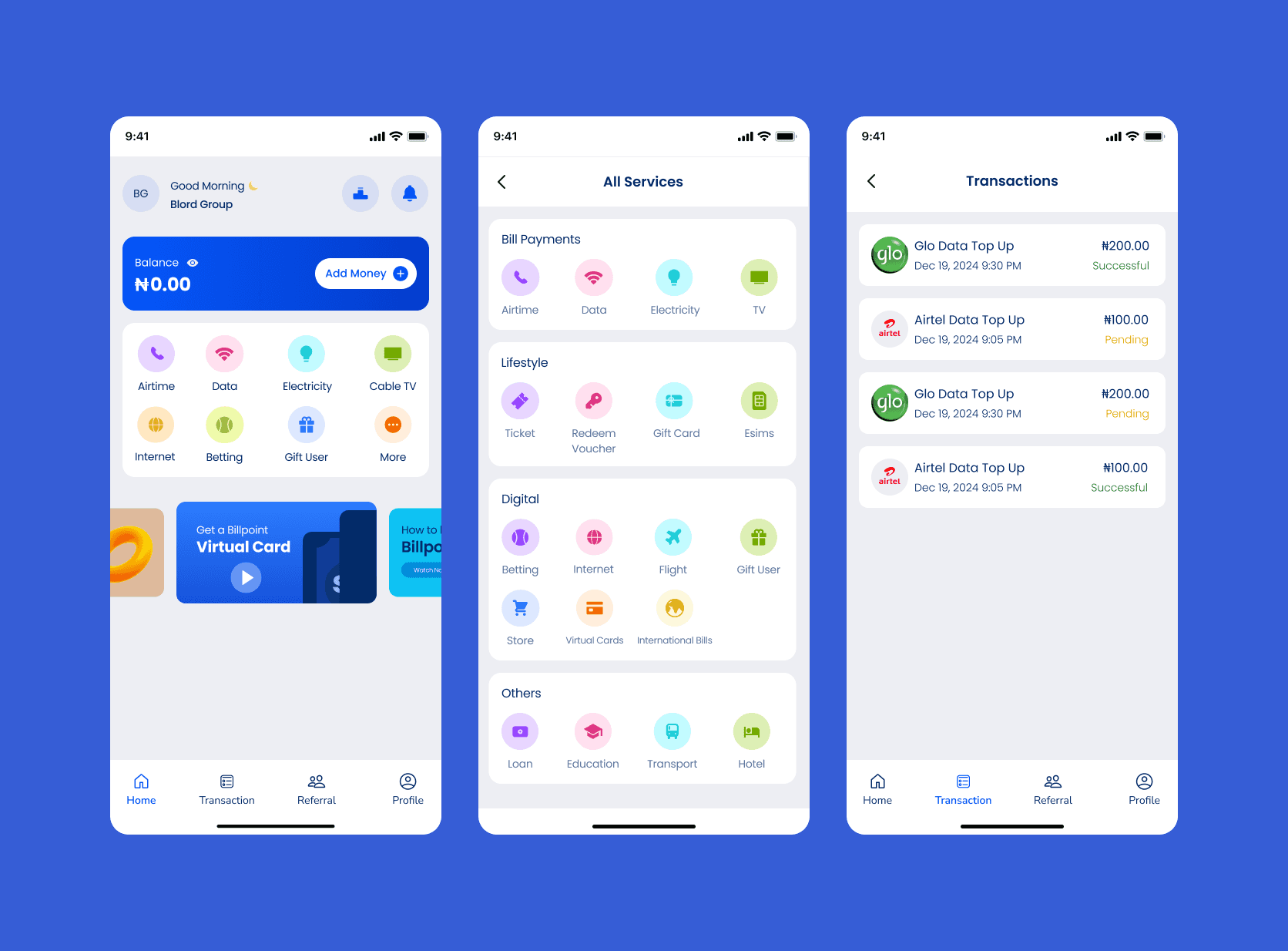 Designed intuitive dashboards that showcase bill payments and other services clearly.