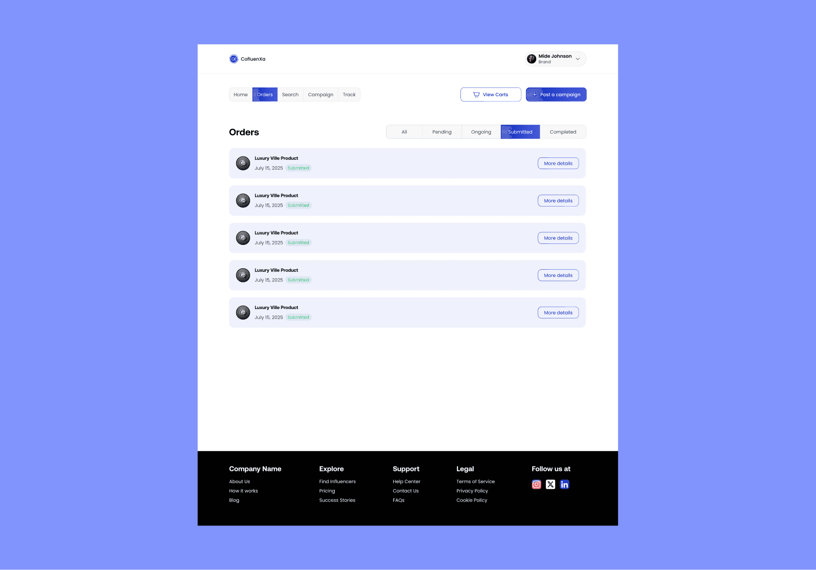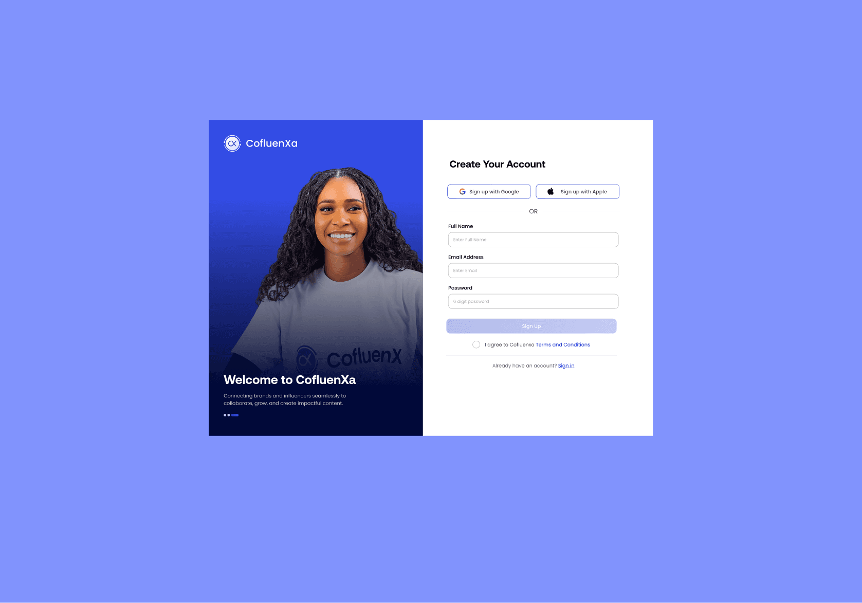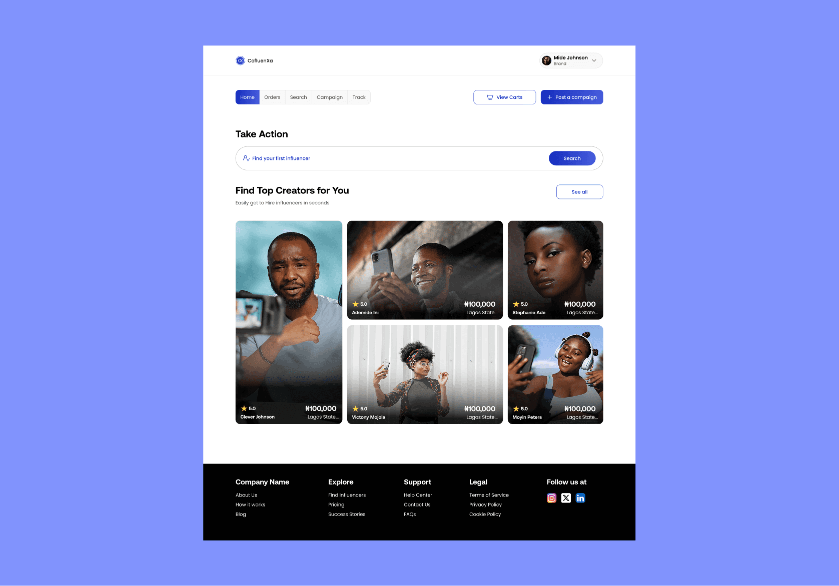 Designed a streamlined onboarding flow for brands and influencers, including sign-up, sign-in, and account setup.