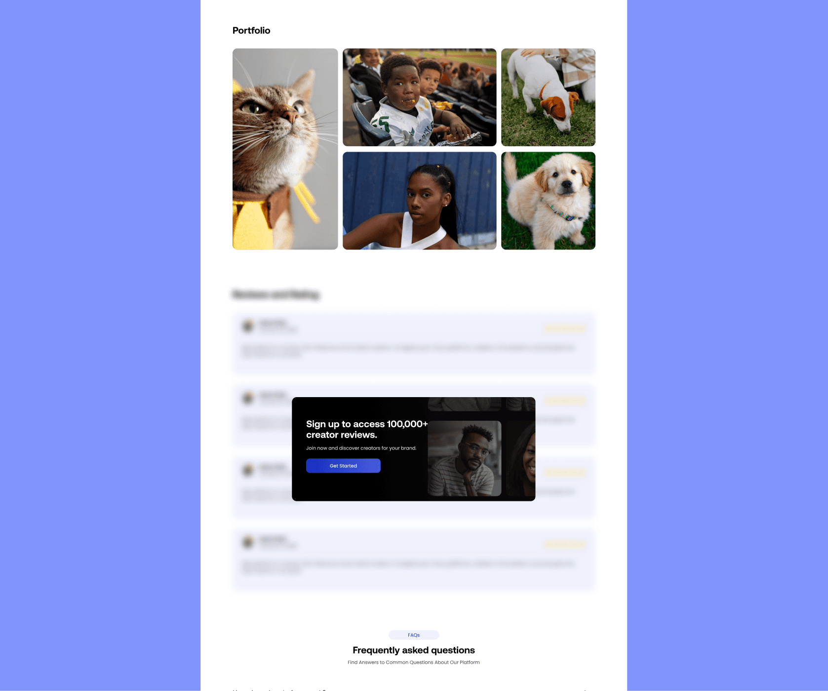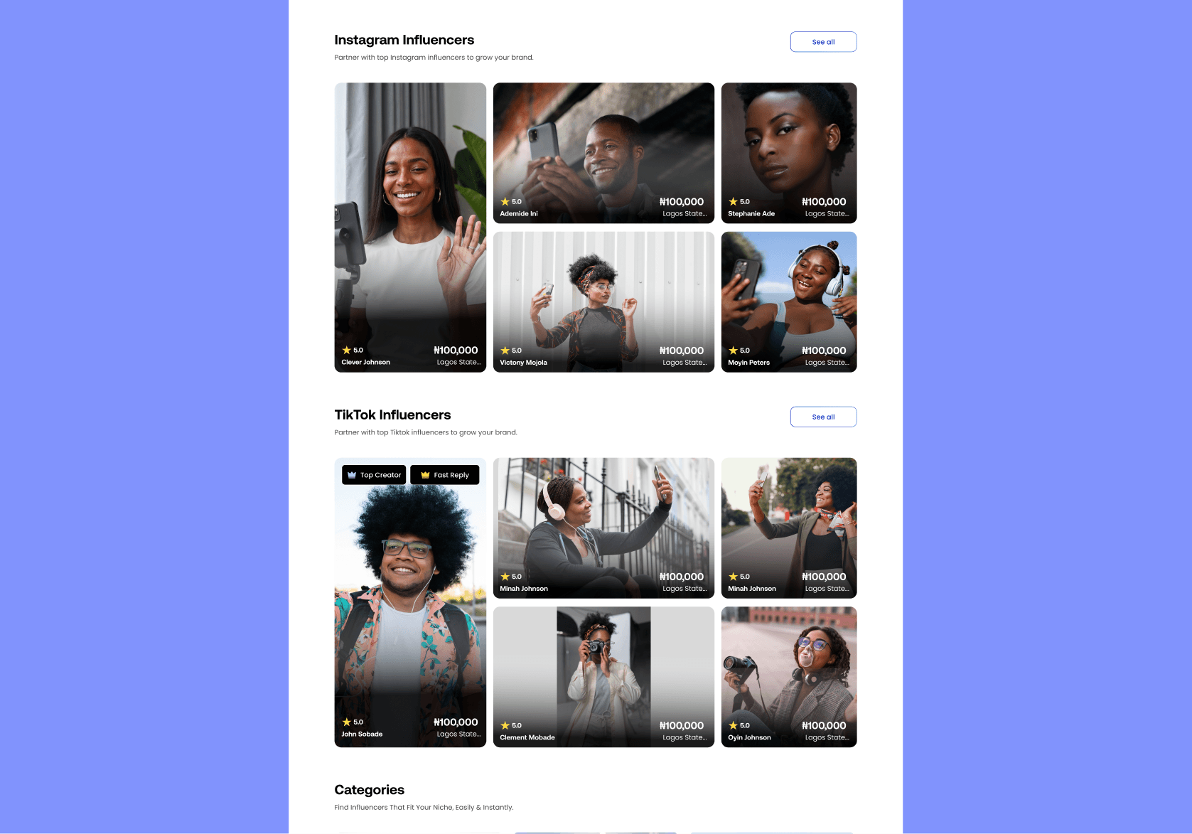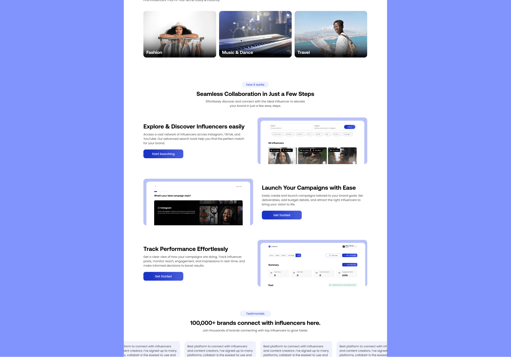 Designed a streamlined onboarding flow for brands and influencers, including sign-up, sign-in, and account setup.