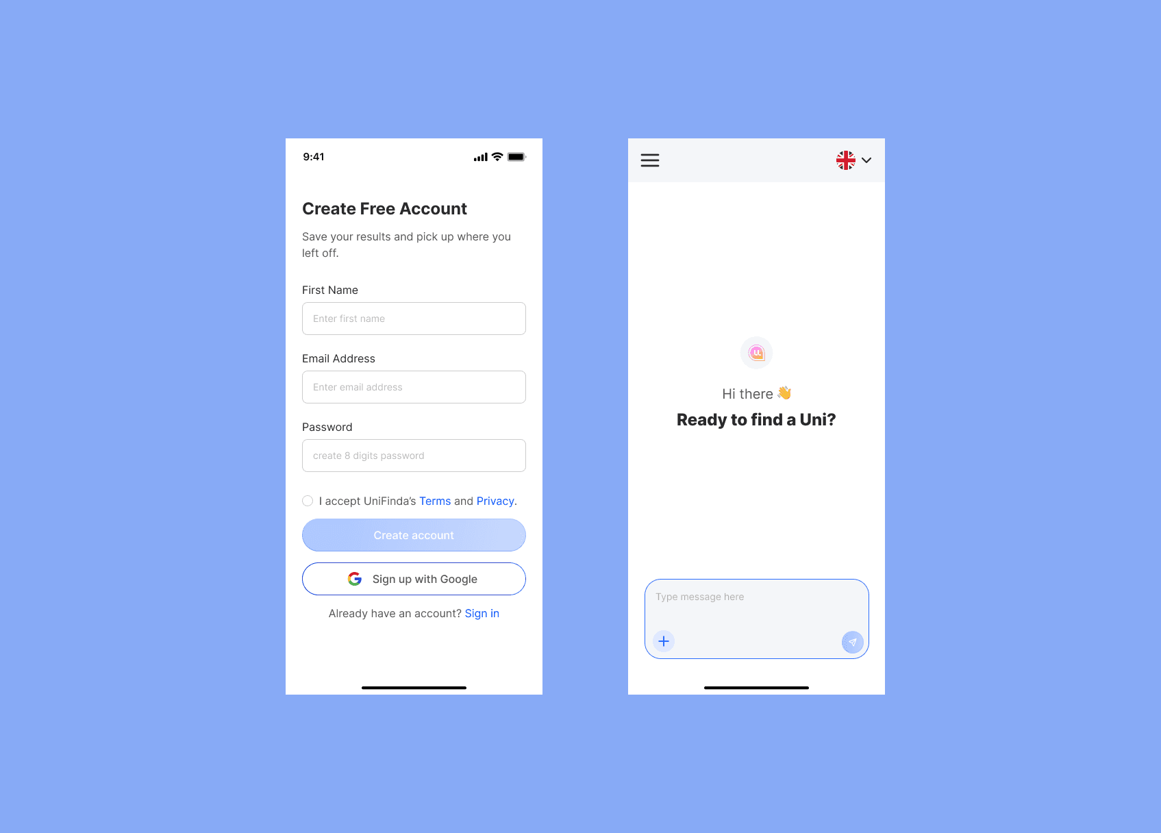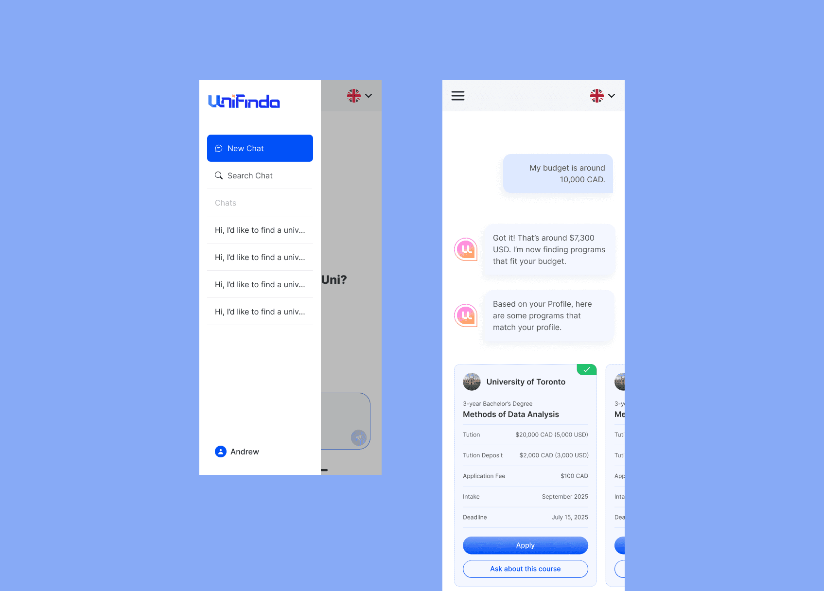 I designed the full product experience — from onboarding to the AI-powered matching flow — ensuring that users can easily input their details and instantly receive personalized university recommendations based on their goals, budget, academic profile, and preferences.
